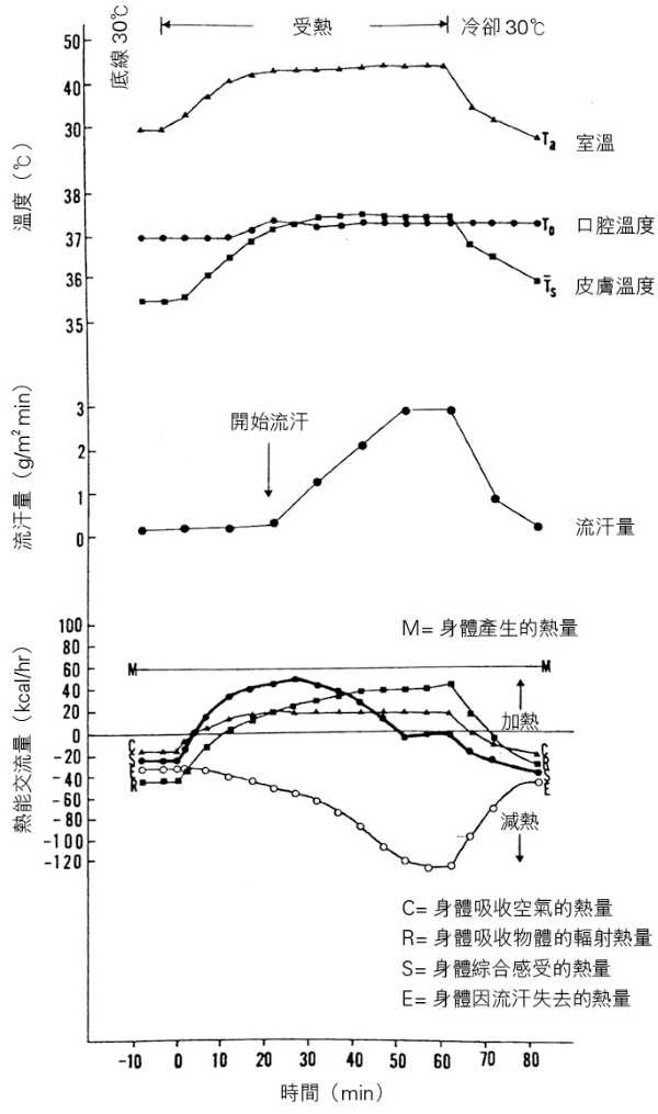 圖中顯示當一個只穿泳褲的男子(實驗者)進入炎熱的房間時,他的皮膚平均溫度(Ts)因吸入熱能便隨著室溫(Ta)升高,這時他的身體感受到M, C, R, E熱能的衝擊,而計算出一個熱能總數S(存熱量)。用熱力學的計算,這個S=M+C+R–E。圖中下部顯示人體感受到這些熱量的升降,在炎熱房間裡,空氣的熱能(C線)和四面八方物體的高溫輻射(R線)都在上升,S線是最粗的一條線,它綜合了身體感受的熱量。大家可看到當S線升到最高點時,皮膚開始流汗,汗水蒸發幫助身體散發熱量(E線),於是S線開始下降。最神奇的是,當S線下降到零時,腦部便叫汗水保持在那個水平,S線在零點保持了十分鐘,而口腔溫度在整個實驗中都保持在37.0至37.3℃之間。