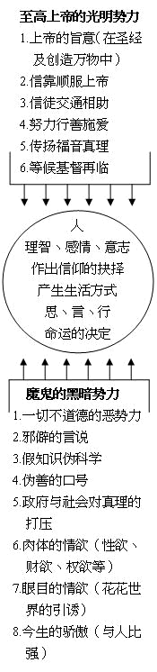 光明的势力也是真理的势力,它的表现是敬畏上帝──天地之主丶和平丶良善丶自由丶负责;黑暗的势力即是邪恶的势力,它的表现是抗拒上帝丶武力丶强迫丶欺骗丶伪善。魔鬼原是上帝所造大能(但非全能)的天使长;因为骄傲自大,要与上帝同等,平分治权,以致与它的随众被逐出天堂,成为反叛的黑暗势力。